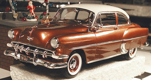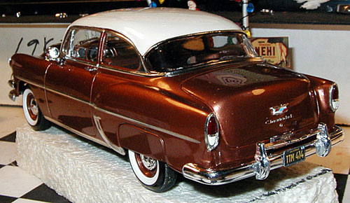 styrene then chrome foiled over with trimmed decal from '55 Chevy kit. The front bumper is '53 Ford! It fit fine with a little tweaking and trimming. The head light frames are modified '51 Chevy, the engine is from the Monogram '53 Belair kit and so are the back bumper guards & bar. The hub caps are trimmed down Revel '57 Chevy and the trunk script is photo etch. A true "Bone stock" '54 Chevy 210 sedan.